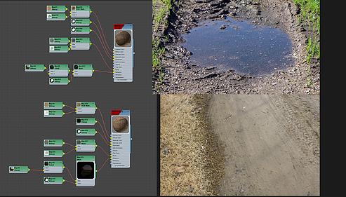 여기에서 젖은 부분의 리플렉션을 없애고, 범프맵을 원상태로 돌리고 어둡게 만든 젖은부분의 밝기를 조금 더 올려주면, 말라가고 있는 바닥같은 느낌을 내줄 수 있습니다.