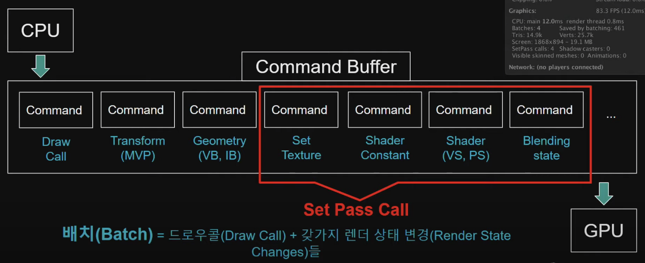저 명령들을 묶어둔 이유는 저 4가지가 GPU에 부하를 많이 주는 것이기 때문이고, 따라서 최적화를 위해서는 Set Pass Call을 줄여야 한다.