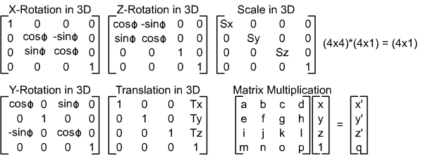 위와 같은 연산들이 있다고 한다. 사진에서 볼 수 있듯 3D 변환은 4x4 행렬로 표현된다.
